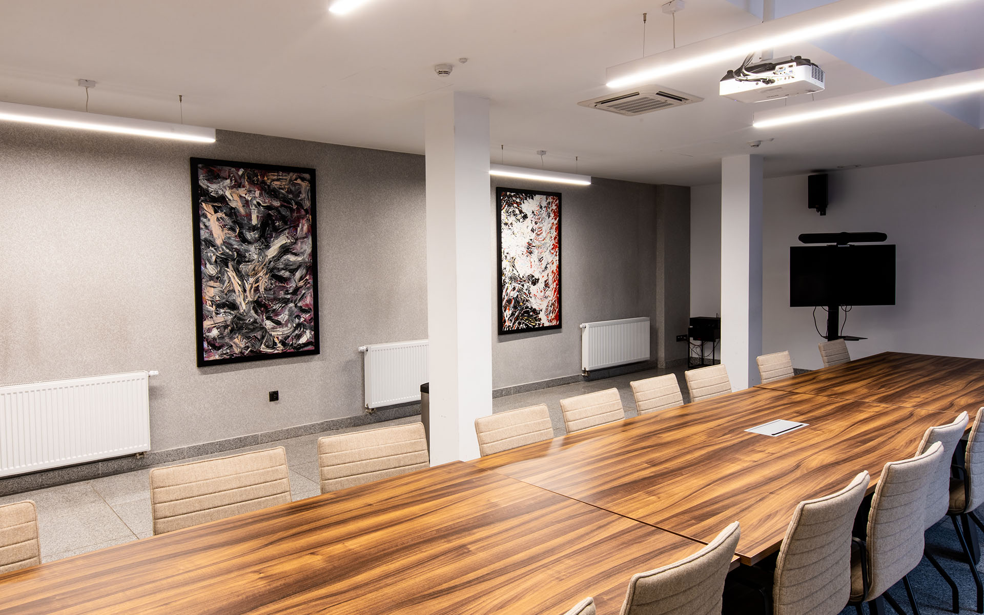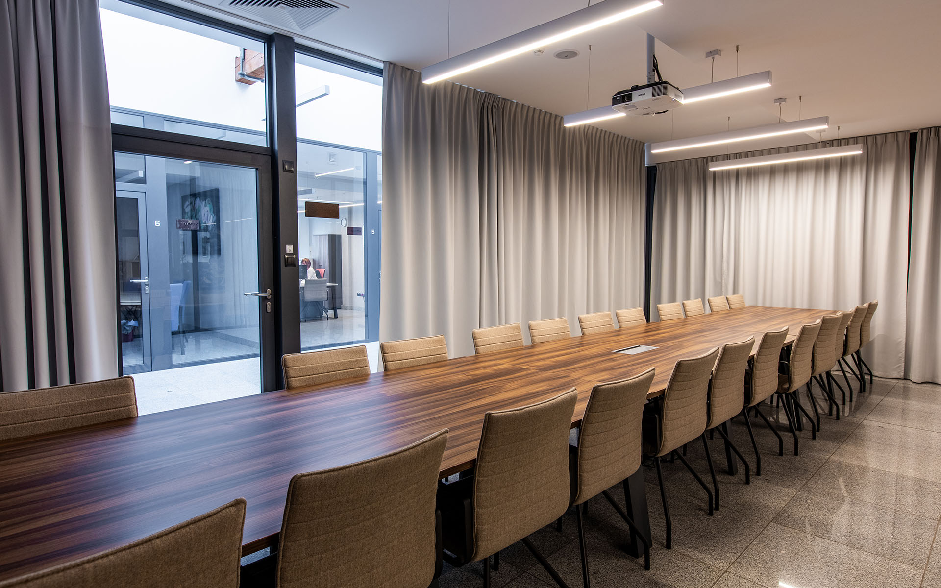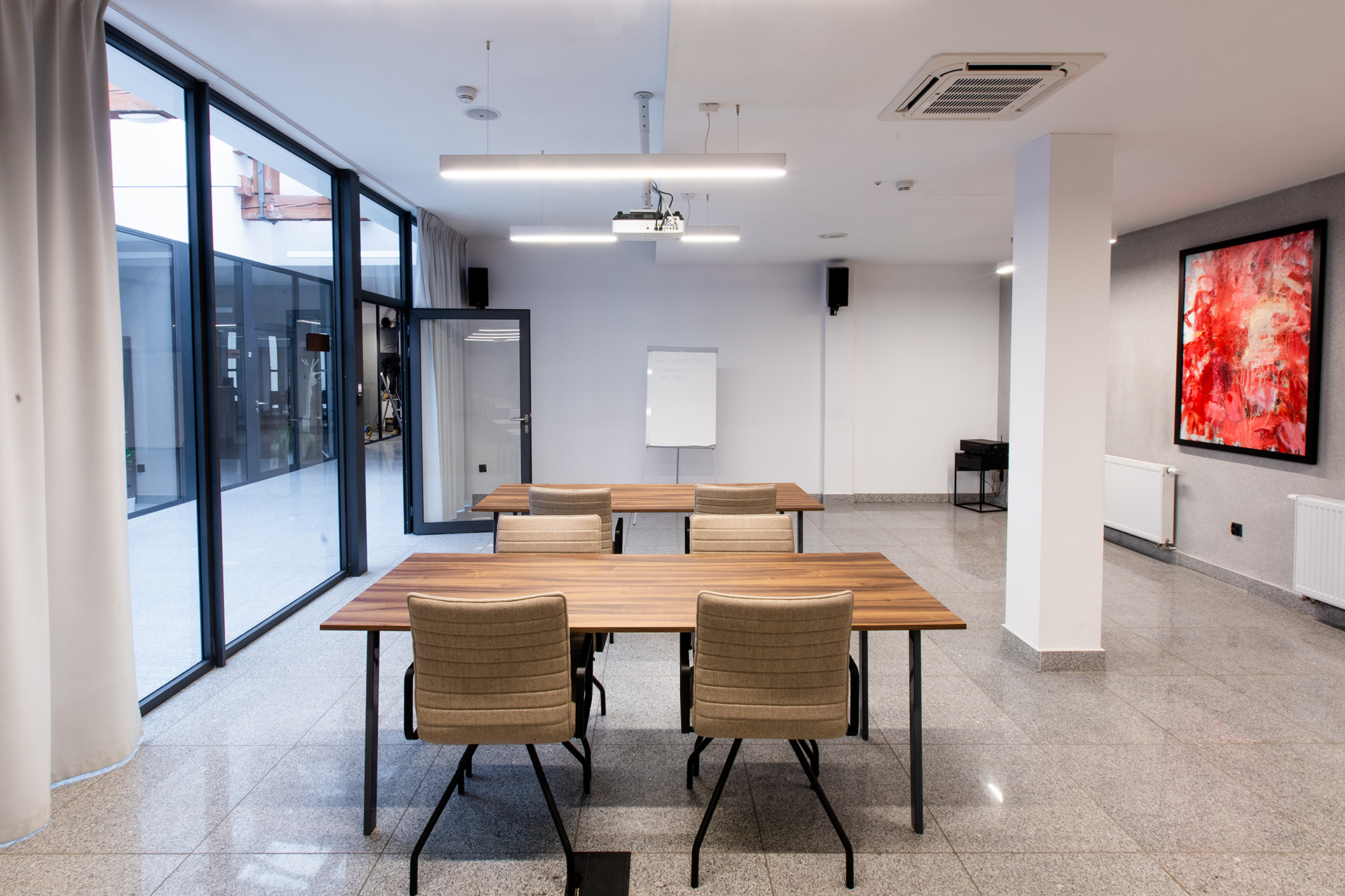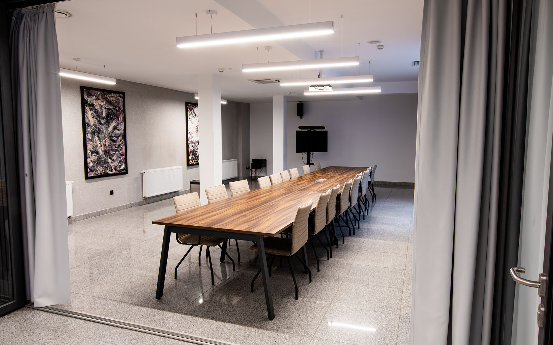 Dysponujemy dwiema odrębnymi salami konferencyjnymi z możliwością połączenia ich w jedną dużą przestrzeń.